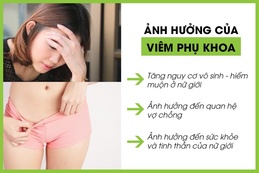 - Viêm nhiễm phụ khoa không chỉ ảnh hưởng tới bản thân người bệnh mà còn ảnh hưởng tới hạnh phúc gia đình. Khí hư có mùi hôi khó chịu, thay đổi màu sắc lạ ảnh hưởng trực tiếp tới đời sống sinh hoạt vợ chồng. Hay nói cách khác, chính bệnh viêm nhiễm phụ khoa khiến phụ nữ mất đi sự tự tin vốn có, họ cảm thấy kém hấp dẫn và khó hòa hợp trong chuyện ấy. Bị đau khi giao hợp, chảy máu âm đạo còn làm giảm ham muốn tình dục. Phụ nữ mang thai mắc bệnh phụ khoa có thể khiến cho môi trường trong lòng tử cung và ống sinh bị lây nhiễm, gây hại trực tiếp tới thai nhi, khiến sảy thai, thai dị tật, thai chết lưu,....